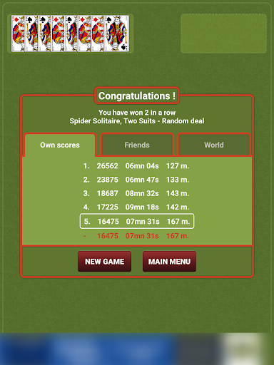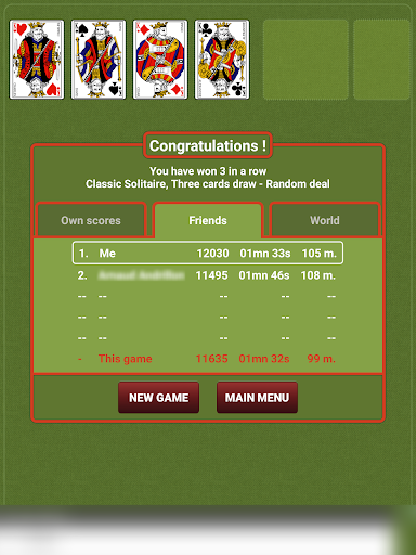 Each endgame discover your personal best scores, but also your online ranking among your friends and all Solitaire Andr players !