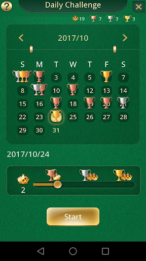 Daily challenges - Three challenges are waiting for playing every day. Solitaire rewards winners with gold/silver/bronze cups and extra crown(s). Variant daily task from easy to hard: One card drawing, One card drawing without hints, three card drawing.