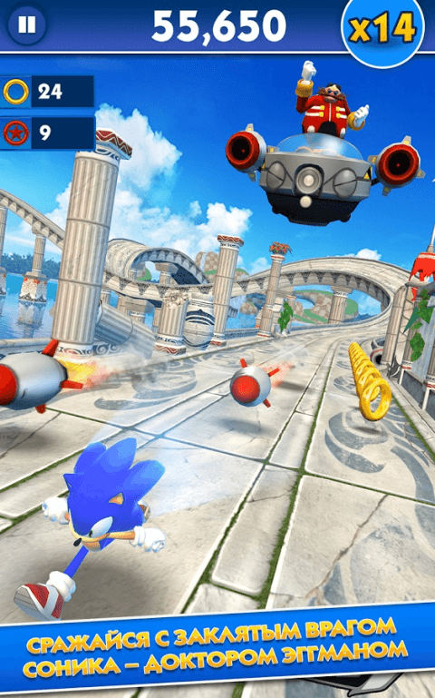 How far will flee the world's fastest hedgehog? Play as Sonic: you, jump and spin your way across stunning three-dimensional scenery. Avoid obstacles in this fast and addictive endless running game-how far. SONIC... Famous hedgehog name of sonic appears in his first endless running game-how far. How far have you run?...DASH! Use Sonic's incredible movement and throw. This will accelerate and run with insane speed, knocking down everything in its path! INCREDIBLE ABILITY Ability Sonic help Dodge from dangers, jump over obstacles and do loops and destructive homing attack will help him to deal with enemies! STUNNING GRAPHICS Colorful details of Sonic's world come alive on screen phone and tablet-never has an endless runner looked so beautiful! A VARIETY OF CHARACTERS Select any of the friends of sonic the hedgehog: Tails, Knuckles or shadow.EPIC BOSS BATTLES Only for a limited time you have the chance to fight face to face with one of the most disgusting and the worst enemies of Sonic Lost World – boss Sassy, one of the most dangerous members of the Deadly Six stunning. So use all the skills and abilities of Sonic vs Zazz and defeat the enemy before it's too late! IMPROVE Unlock, win or buy ingenious power-UPS to help you run further the jerks at the start, the resurrection of the magnetic ring! THE RUN CONTINUES The more you play, the more rewards you get! Increase your multiplier account, completing unique missions, or win amazing prizes including Red Star Rings red star rings and additional characters by performing regular tasks and daily rotating wheel of Fortune. SOCIAL GAME Challenge your friends on leaderboards or among friends on Facebook to prove who the best speed runner is...