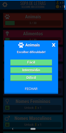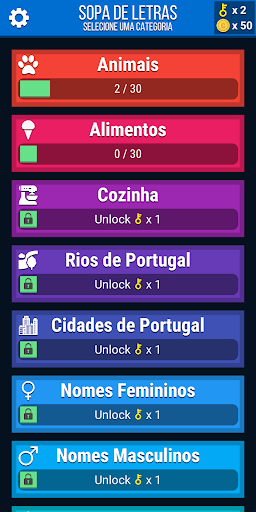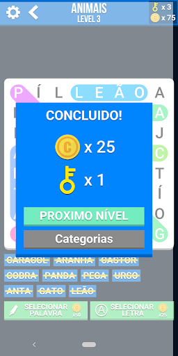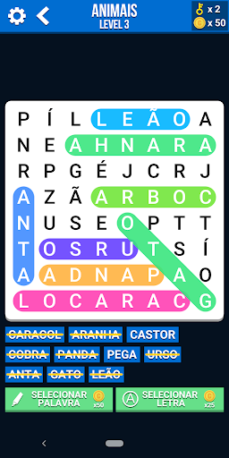 Sopa de letras ou caça palavras é um jogo para procurar palavras escondidas numa grelha. Esta versão tem um sistema de níveis e desafios que podem ser desbloqueados, sendo que o nível de dificuldade vai aumentando.