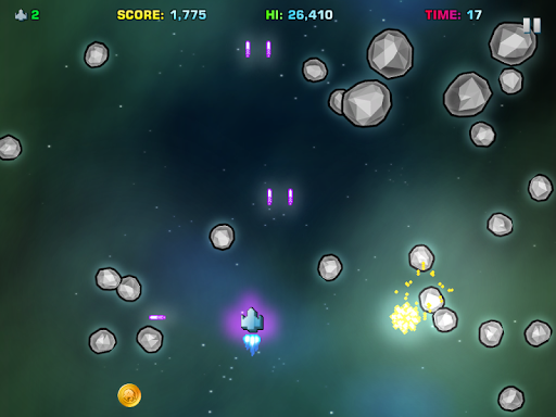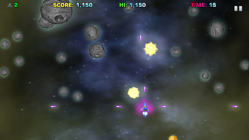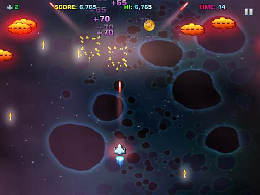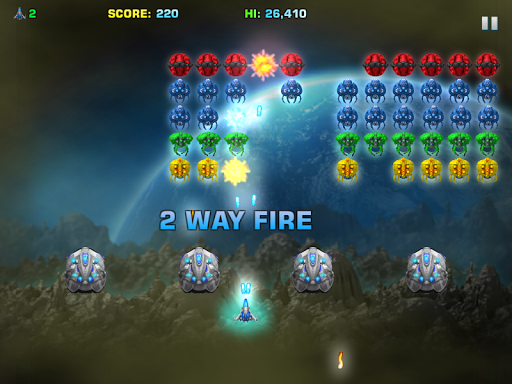 Power-ups include Rapid fire lasers such as 3-way fire, spray fire, spread fire and rapid bombs. Super lasers cut right through and take out multiple targets. Collect shields that rebound laser fire back to the attackers. Collect Black Hole Warp technology to bend time and space. Use the EMP Disruptor to make aliens fall from the stars, destroying others in their path.