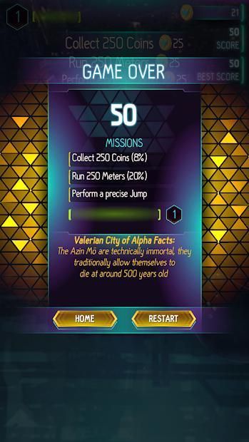 Valerian Space Run is a fast-paced running game set in a futuristic world full of high tech gear and alien landscapes. You can control one of several characters, They’re going in search of tons of precious coins but there’s lots of dangerous barriers, immense gaps and other hazards that they’ll need to avoid while they run, jump and slide through the intergalactic metropolis.you must run through a never-ending level full of obstacles and try to get as far as possible.