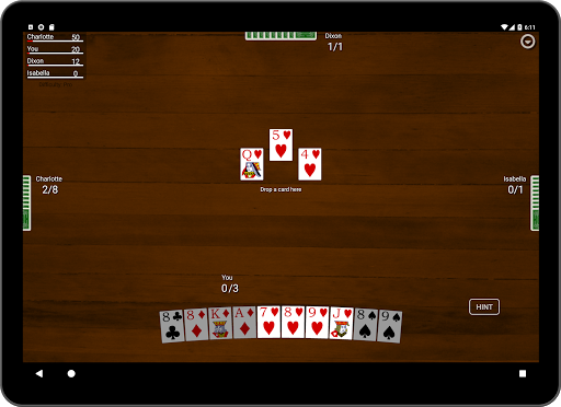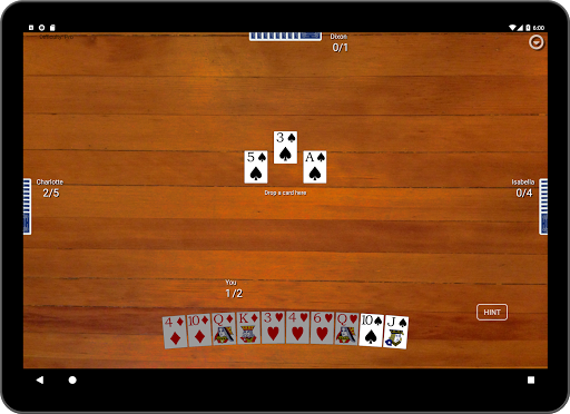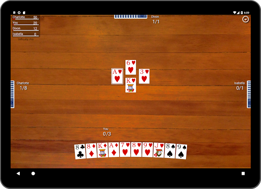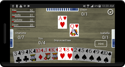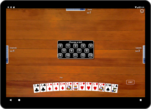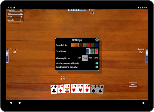 Improve your skills and become a spades pro! Spades Card Classic has three different difficulty settings so you can work your way up to playing like a pro. Statistics are kept for wins and losses so you can see yourself improving over time. All cards are dealt randomly to all players, so the difference between the Easy, Standard, and Pro computer players is in how they choose to play the cards they are dealt. A hint button can be turned on to help you see how the computer Pro player would handle your current situation.