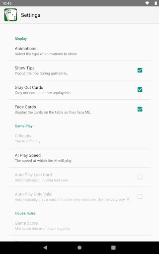 - Display options: Animations, Show Tips, Gray Out Cards, Face Cards