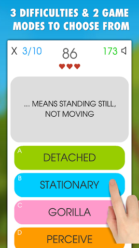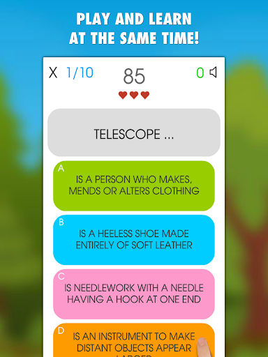 There are 2 game modes to choose from - "Explain word" or "Assign a definition". There are 4 options, choose the correct one, just one option is right! Your score depends on your speed. Get the best score possible in 10 rounds or 120 seconds time limit. Watch out, you can make max 3 mistakes otherwise your game ends.