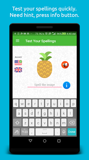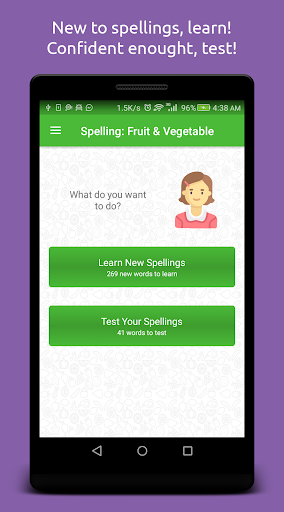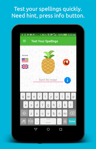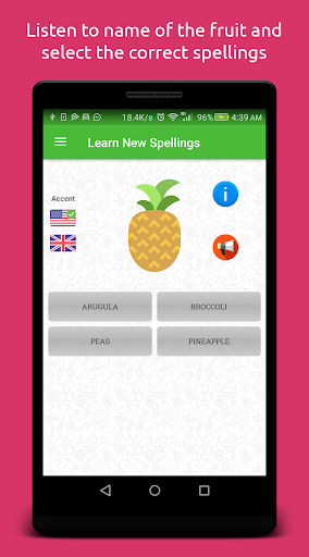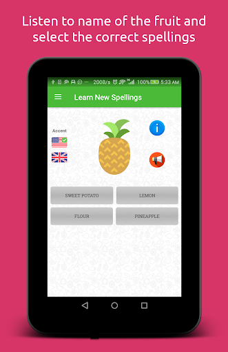 The image of fruit appears on the screen while its name is pronounced through speaker. The user listens to the name of fruit and write down its spelling in the provided field. On spelling the name correctly, next fruit can be called. In case user is unable to guess the spelling, hint of the spelling is available. The app also shows when a new word appears for the first time.
