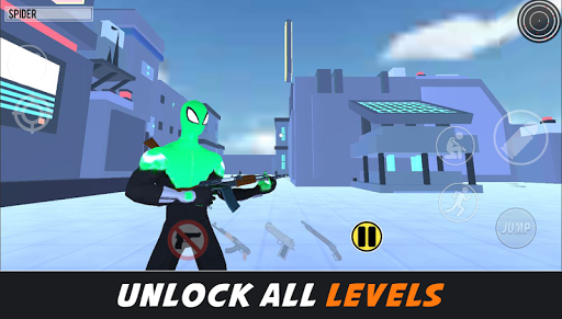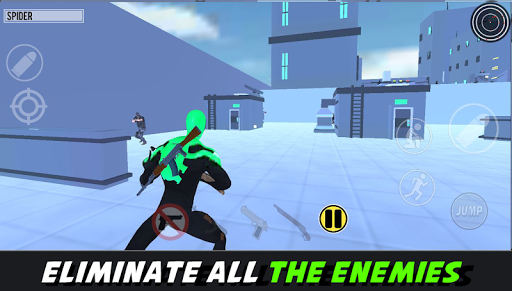 Spider Hero shooter is an adventure game played from a third-person perspective, the player can freely run, jump, and shoot criminals, the hero can use melee attacks and rifles to fight enemies, the firearms include weapons such as AK-47, Desert Eagle and Shotguns.