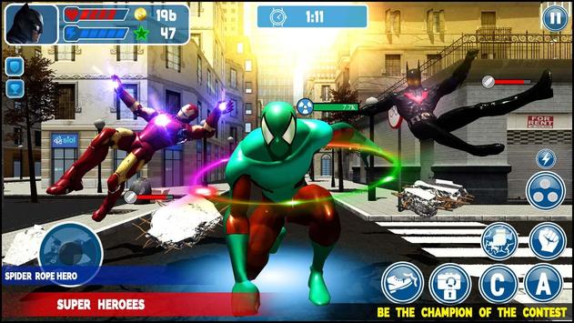 Amazing superhero are in the battle arena against each other for friendly hero game and battle. Amazing spider hero with his kung fu grand action is facing all the other terrible fighters. Multi super villains are attacking with strange powers. flying hero are also there. People are coming to seeing for this amazing flying robot to flying spider tournament. Something happens during this... fighter were in the ring and the whole city is seeing the superhero vs spider and other super heroes game.