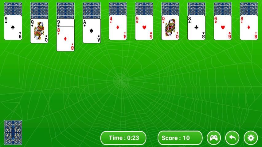 The main goal of spider game is to remove all cards from the table, assembling them in the table before removing. Initially, 54 cards are dealt to the table in ten piles, face down except for the top cards. The tableau piles build by rank and suit sequences can be moved together. The 50 remaining cards can be distributed on the board ten at a time when no batteries are empty.