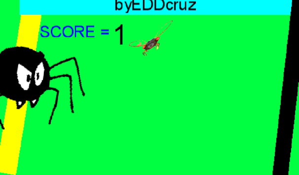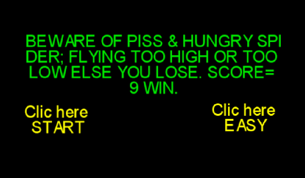Beware of piss & hungry spider. Don't fly too high or too low else u lose. Score 9 to win. TIP: fly can climb down the yellow wall on your left, & climb up via black wall on the right. NOTE: bug fixed in this version.
