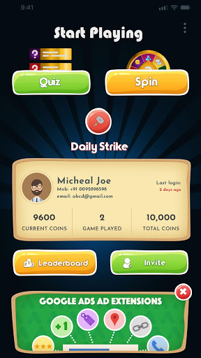 Spin to win is India's actual money Quiz and Spin game. Yes, that's right - Now you can entertain your self and earn on the go. Play and Win guaranteed is simple - Spin the wheel or take quizzes from a bunch of subjects - collect factors for each and every proper reply and win actual money. How does it work? Take a Quiz Choose from over some exclusive topics. Earn one coin for each proper reply Play with Friends Over What's App you can now compete with your Friends for a quiz. this characteristic will test your real aggressive spirit. Spin to Win offers a vast range of subjects including; Bollywood - Identify the movie character, Identify the movie, Identify your favourite actor. Cricket- Rules of the game, Identify the famous cricketer, Identify the well-known venue Basic Math- This is easy tremendous easy. But there are a few tricky questions in there. Guess Who- Guess the celebrity and Many More....... What are you waiting for?
