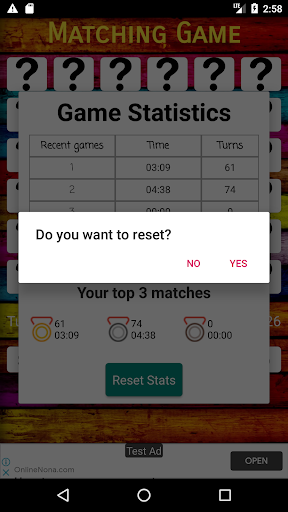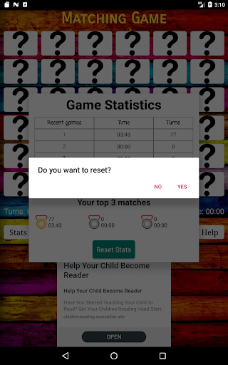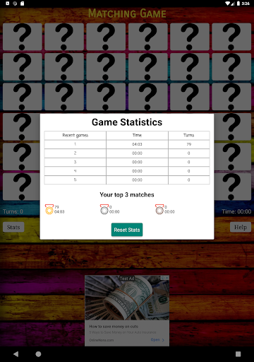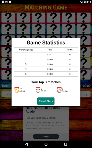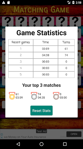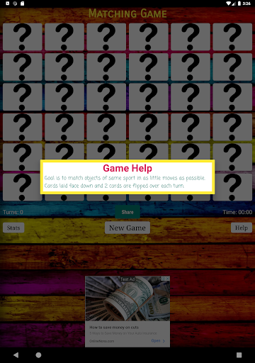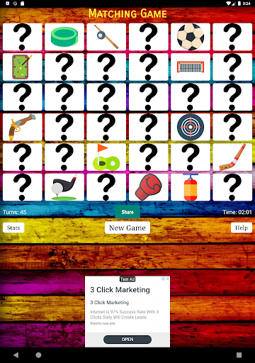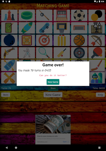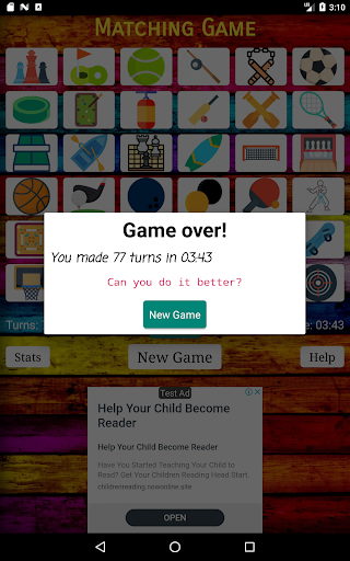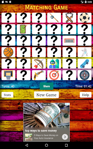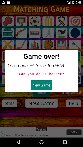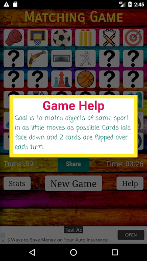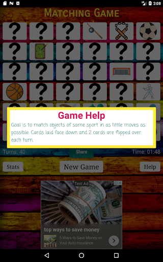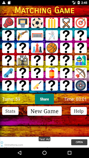 Sports matching game is to match similar sports objects. It will test your memory skills and increase memory power. Stats will have your recent games records.