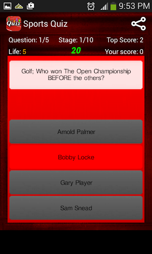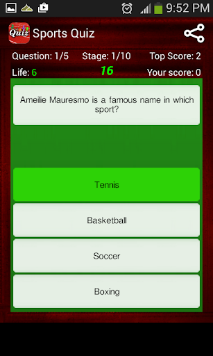 Sports Quiz contains Ten stages, once you complete all of the stages you will get the Cup. Continuously answering 3, 4 and 5 right answers will give you 1, 2 and 3 bonus points respectively and it will also increase 1 life. Answering 1, 2 and 3 wrong answers will decrease 1, 2 and 3 lives respectively. Entering a wrong answer will not quit you out from the game, rather it will decrease the lives and once the life becomes zero, the game will be over.