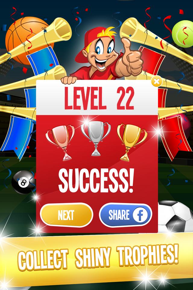 The challenging gameplay is spiced up thanks to our unique boosters & power ups: American Footballer - Takes away a complete row of balls. Golfer - Takes away 1 ball. Referee - Adds an extra point to all balls. Manager - Takes away all balls of 1 kind. Think well how to use them and build your sporty strategy! Once you finish the level, you’ll need at least a bronze medal to unlock the next levels. Try to obtain all gold medals to earn awesome achievements. Find the hidden golden medals by completing the mission goals and change them for tons of goodies and boosters to help you on those tricky levels! Take care of your energy drinks; these are your lives! If you run out of drinks, you can watch videos to continue playing! Perform big combos and build huge chains to