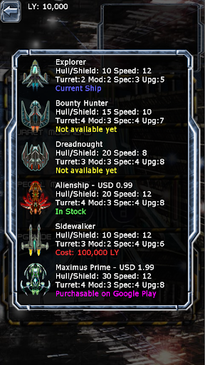 # LY (Light Year) is the game currency for purchasing ship upgrades and for unlocking new galaxies to venture forth. Spend it wisely!