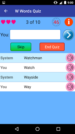 Start With - This spelling app also provide a facility to pronounce (speak out) the word so that you will know how to pronounce /speak the word spelling and will enhance the vocabulary.