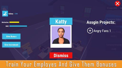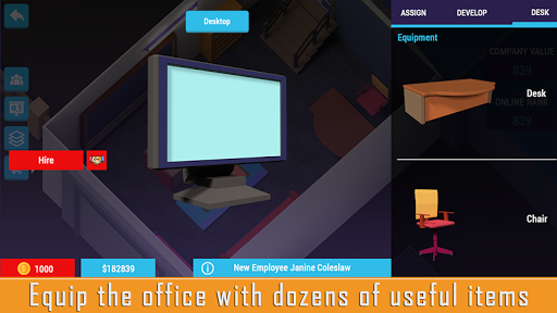 - Assign projects to your employees by clicking on the desk, train employees, pay them bonuses and equip the office with dozens of useful items such as a billiard table and coffee machine.