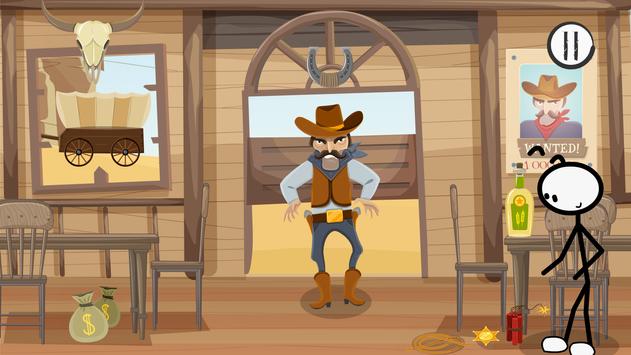 You will play Stickman with the Cowboy in the Wild West. Your main character went to the bar to moisten his throat with a tart whiskey. Everything was fine, until the wanted and dangerous criminal came to you. Your task is to find all successful ways to escape from the bar, otherwise serious problems with the bandit and not only will await you. Mindfulness and logic will help you in this game.