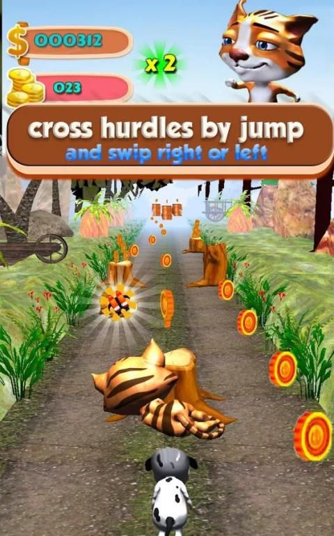 Wonderful and awesome cartoonish environment for cat run subway endless. Dog is behind your Cat, so run fast as can and collect more and more coins in less time. Use swap left, right and up/down to avoid hurdles.