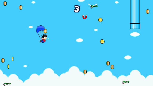 The Super Hero flies with the help of a magical parachute, touch the screen to open the parachute and touch again to release the parachute and so try to divert the monsters and obstacles.