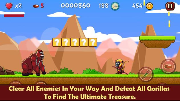 Super Monkey has to run through the deep jungle, avoid traps, clear all enemies in your way and defeat all Gorillas to find the ultimate treasure.
