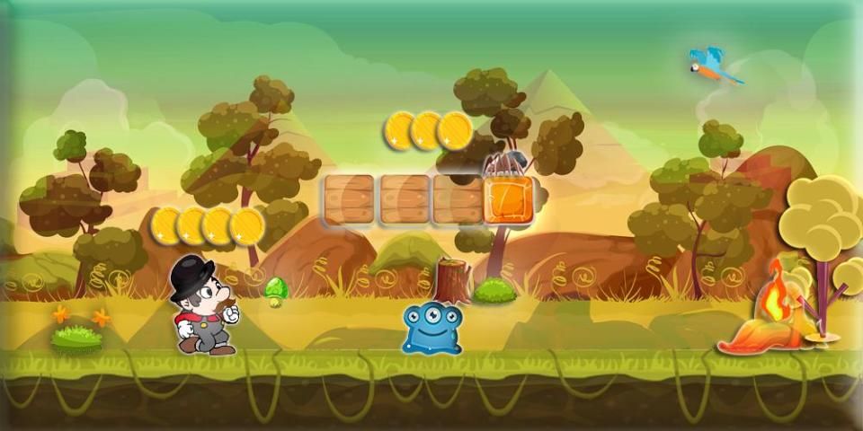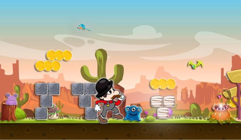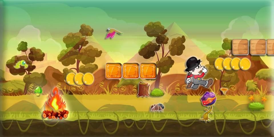 Adventure Jungle World runs and jumps across platforms and stops enemies and antagonists during the levels.