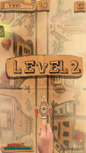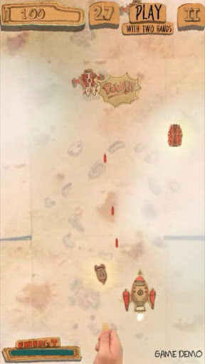 In this game all the elements are drawn on cardboard by hand, the explosions and effects are also cardboard and all the sounds are made with human voice. You can also separate the character in two and play with both hands.