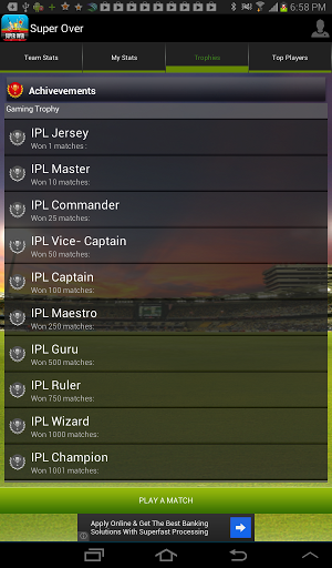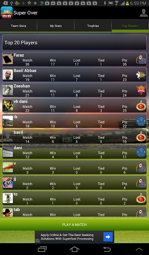 Play a Super Over IPL match with people around the world! Simply download the android app and start playing. The app will instantly search for players around the world and randomly select an opponent form another team.Your scores are updated in real time. Get yourself and your favourite team to the top of the players and team lists.Looking to get your favourite team to the top of the list? Share your scores on Facebook. It really helps. Thank you for all your support. We have included ads to support our game servers. These are our sponsors who make all this possible. Without them we would not be able to support such an awesome online gaming experience. Kindly support us with your reviews. All the best!! Happy Gaming.DISCLAIMERBy downloading our app you are agreeing to comply with and be bound by following terms and condition of use, which together with our privacy policy govern TECSOL software Pvt. Ltd.’s relationship with you in relation to this app.In this terms and condition, the term ‘TECSOL’ or ‘Super Over – IPL Edition’ or ‘us’ or ‘we’ would here and after be referring to the owners and people working for TECSOL Software Pvt. Ltd. The terms ‘user’ or ‘person’ or ‘you’ would refer to the user or viewer or the party who has downloaded the application.The Indian Premier League will be here and after be referred as IPL in this description and also in the application.The use of the website or application is subjected to the following terms and conditions of use:➢The provided over all designs of the pages in the app is completely the property of TECSOl Software Pvt. Ltd. and can be changed without notice. However the logos, description and team names of various teams of Indian Premium League are sourced from Google image search and Wikipedia.➢We claim no rights to any of the logos, description and the IPL team names, they are the property of their respective owners.➢We are in no way connected to the Board of Control for Cricket in India (BCCI), the Indian Cricket League, IPL or any other cricket association.➢Any content visual or text related to IPL are completely taken from the internet and is in no way related to us. And any ambiguity in authenticity and discrepancies cannot be held against us.➢The audio used in this application are also from various sources of the internet and it completely belongs to its composers or up loaders, and we absolutely have no rights over these audio used in the app.➢Through this app we do not promote any kind of unethical or illegal activates that are against the laws of land. ➢This app does not encourage any kind of team rivalry or any other competition created from the user group.➢This version of the application is completely free and trading it for money is a punishable offence.➢ The free version of the app has ads in it and you are able to link to other websites which are beyond our control. TECSOL Software Pvt. Ltd. have no control over the nature, content or the availability of any linked websites. ➢This app requires you to provide a name and choose a team beyond which no information will be collected. However, it does require you to sign in through facebook or twitter in case of sharing the results of the game on these sites and we abide by the terms and conditions of the sites.➢In no event, shall SUPER OVER – IPL EDITION or TECSOL Software Pvt. Ltd. be liable for any damages (including, without limitation, damages for loss of data or profit, or due to business interruption,) arising out of the use or inability to use the materials on App.