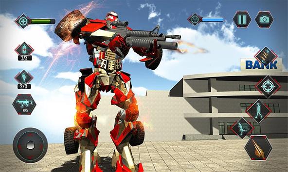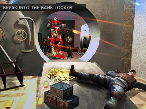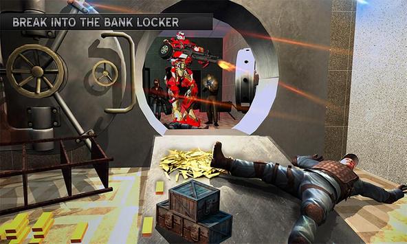 Reach transformation point with your robbery squad and quickly transform yourself from X robot into an amazing robot steel car. Go on super speed robot car drive with your robbery squad to reach robbery spot quickly. Once you reach the bank begin shooting with your advanced weaponry. Clear bank entrance along with your robot robbery squad with super amazing shooting skills and then move inside bank for theft. Kill and shoot as angry furious steel X robot warrior to clear your way. Use all you super sniper shooting skills and help your master robbery squad in this furious battle. Be the dare devil robot master and enter into locker room to find gold and cash. Steal gold and cash and exit by transforming robot into steel car, escape bank after completing stealing mission and return to your robot home with fellow gangsters. Enjoy simulator plus action game shooting experience.