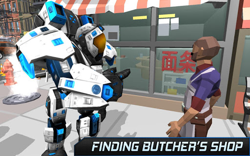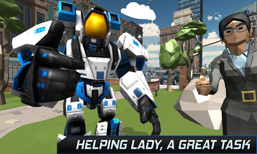 Real flying adventure with the flying superhero robot over grand polygonal city in action simulator game. Fly over huge skyscrapers and fly low to help the people in need.