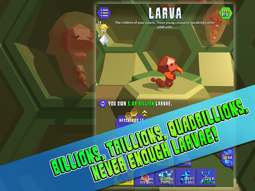 • Idle mode - the game will keep progressing whether it's open or not, take a break for a few hours and your Swarm will grow and grow!