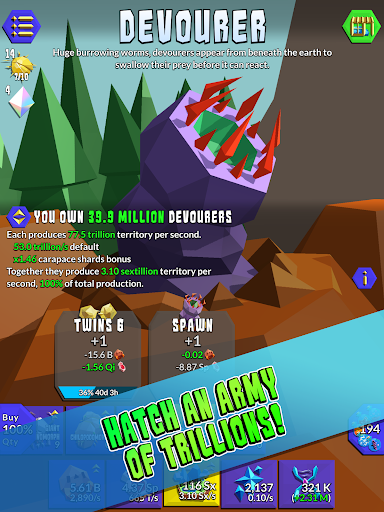 • Endless progression - start with a few lowly units, evolve and hatch your way to unimaginable numbers.