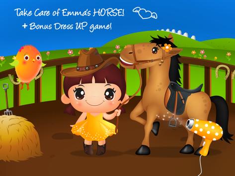 Go to horse stable and help Emma feed, bath, wash and take care of her funny pet horse. As a reward, you will get a bonus game – Emma’s and her horse fashion dress up! Choose from the cutest and most adorable clothes for girls and horses, design the perfect outfit for riding and make a cool selfie!