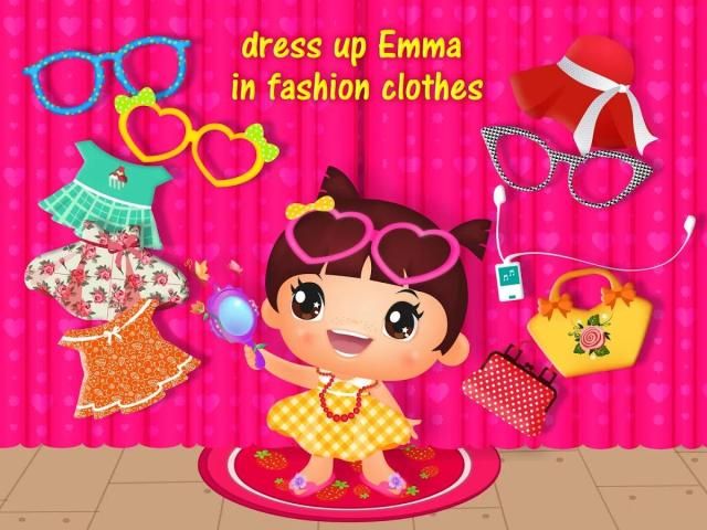 Emma is a Princess who loves to dress-up in colorful fashion clothing. Create new combinations and looks by changing the items: dresses, shoes, hats, bags, glasses and much more in various models and colors! There are lot of fashion combinations to choose from!