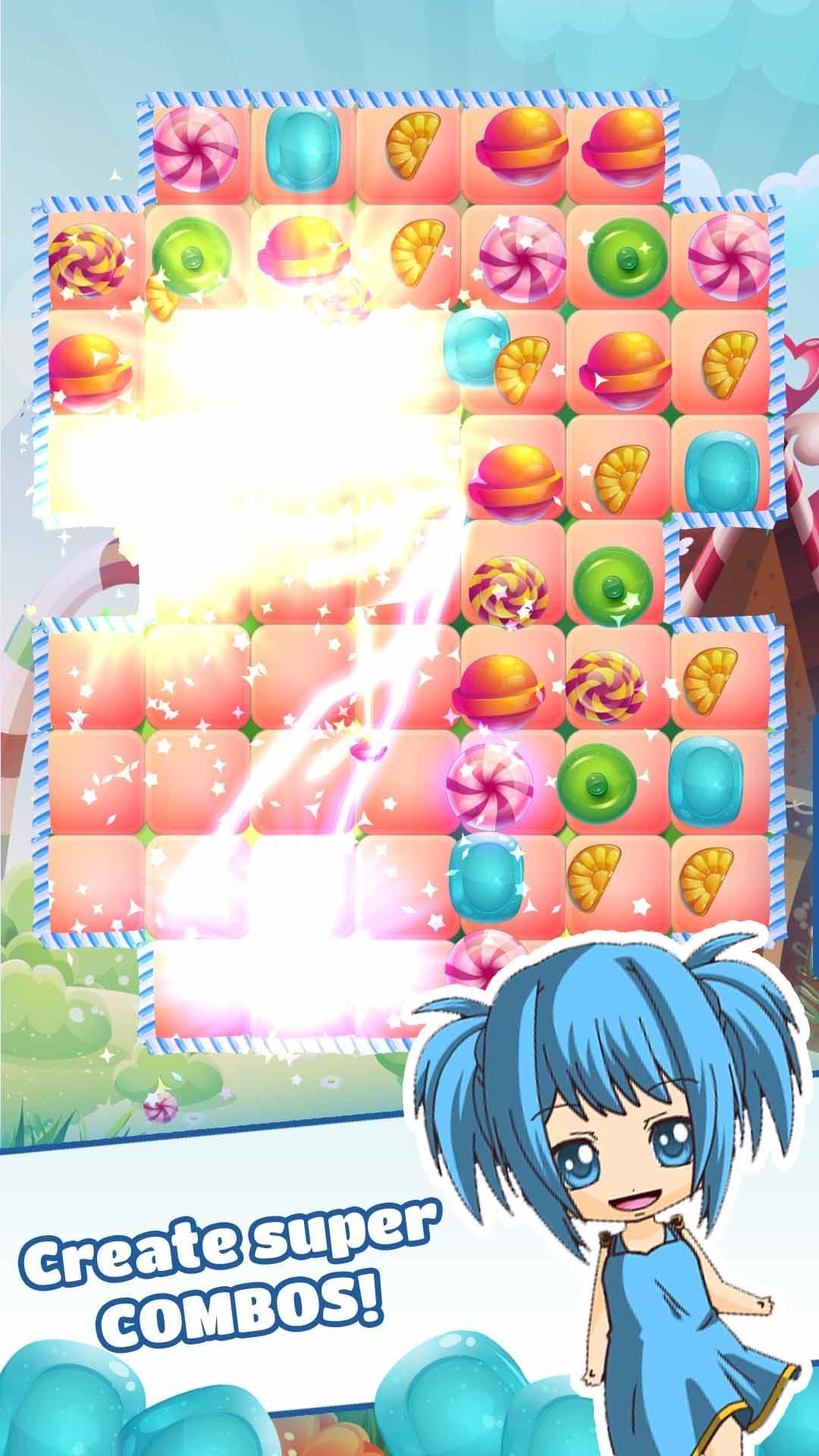 To progress in the game you have to match 3 or more of the same candy either horizontally for vertically. If you match more than 3 of the same candy then a super sweet will be created with it's own special power up. Blow these up for extra effects and flavor filled explosions!