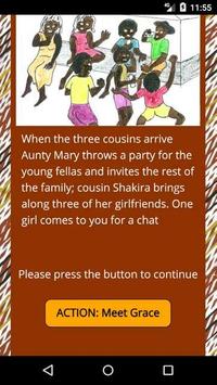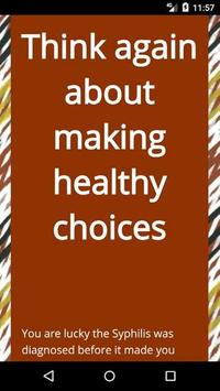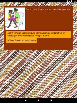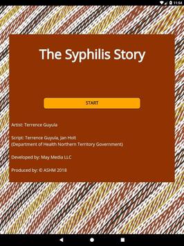 The Syphilis Story: Mens version tells the story of a young man leaving home and community to travel to another town for study. Along the way he meets several women. The player must decide what happens with each interaction. At the end a series of Syphilis health messages are given depending on the choices the player makes.