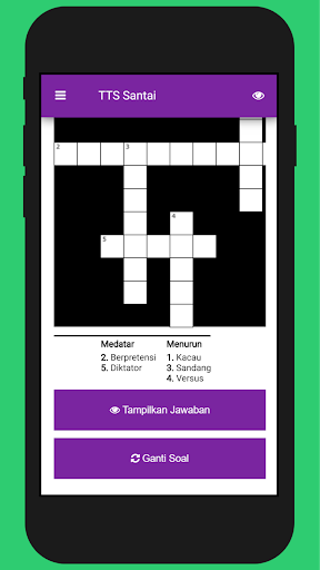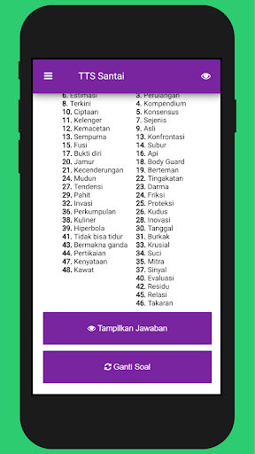 Saat kamu memainkan TTS ini, kalau kamu tidak tahu jawabannya, tinggal tap tombol "Tampilkan Jawaban" lalu kamu akan melihat semua kolom terisi. Tekan tombol itu kembali untuk menyembunyikan kunci jawaban.