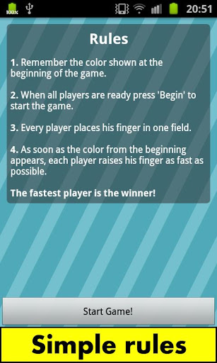 Lift your fingers if a certain color or sign appears. The fastest player wins the game! But be aware: The game trys to confuse you :)