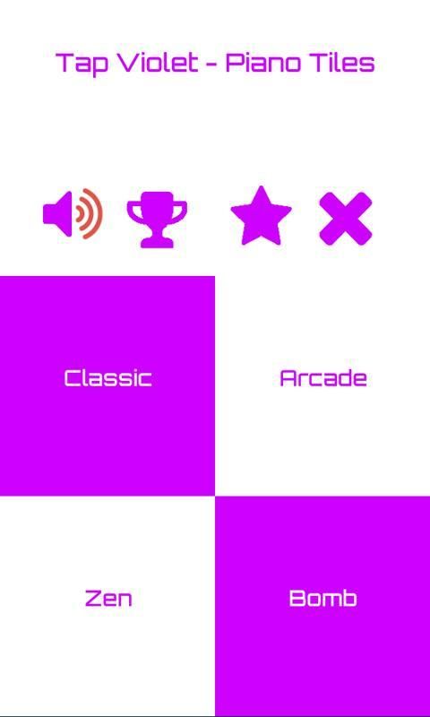 Tap Violet - Piano Tiles is an very addictive violet game, it's so funny. Tap the violet squares instead of the white ones. Don't miss out any one of the violet squares. It also has interesting piano sound when you tap on the tiles. You can test your speed and accuracy. The game includes 4 modes: Classic, Arcade, Zen and Bomb.