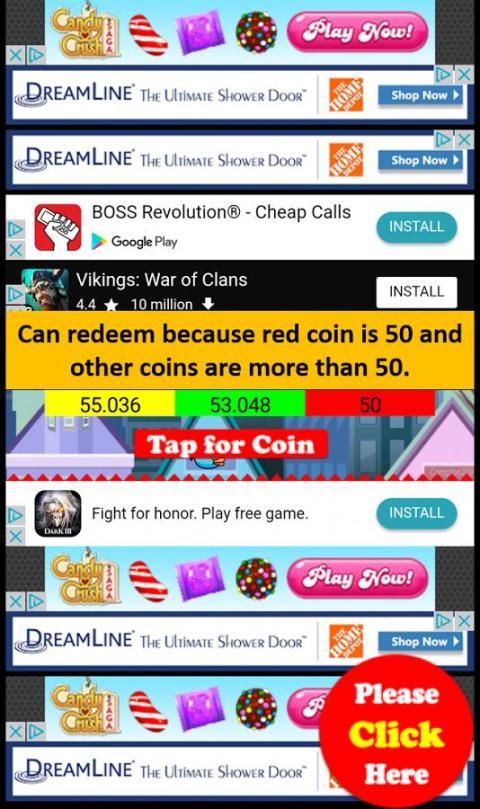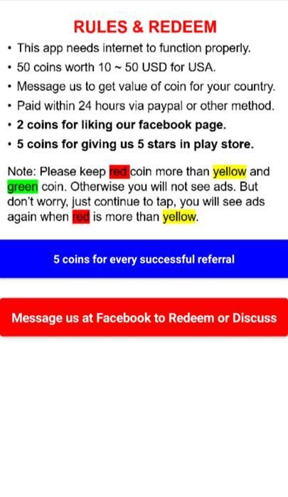 • Please keep red coin lesser than yellow and green coin. Otherwise you will not see ads. If it happens, don’t worry, just continue to tap, you will see ads again when red is lesser than yellow.
