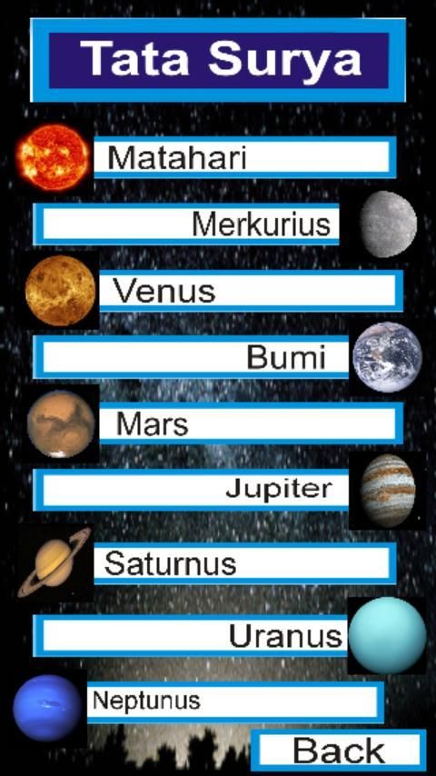 contains a basic knowledge of the solar system in the form of the sun and planets such as Mercury, Venus, Earth, Maars, Jupiter, Saturn, Uranus, etc.