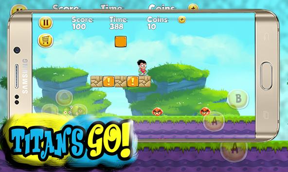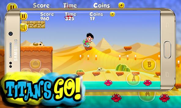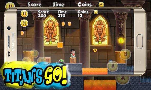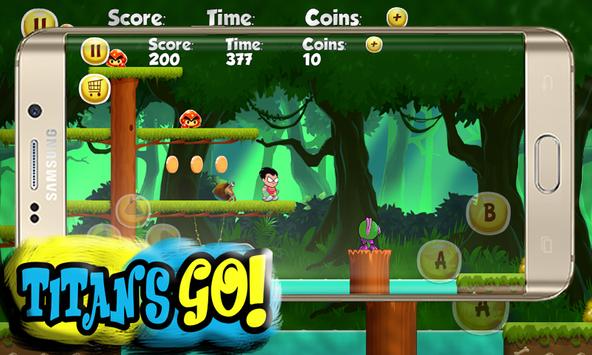 Teen Jungle Titans Adventures Go! Is a running game about titans Go! who is tryingto save his friend after they were kidnapped by a big monsters in the wild jungle adventure . Titans go needs to save his friend from the black castle where the big vicious monsters jailed them. Download right now and enjoy one of the best jungle adventures games around with and titans go. Titans go needs you help to cross the wild jungle adventures and save robin's friends to regroup him with the titans go. Collect power ups in order to start shooting explosive bombs with titans and go to the black castle to save his friends . Power up titans go and start shooting monsters from distance is the best way to kill monsters. This game is very easy barely needs any instructions, all you have to do is to run and jump over monsters and dodge obstacles to keep titans go! alive.