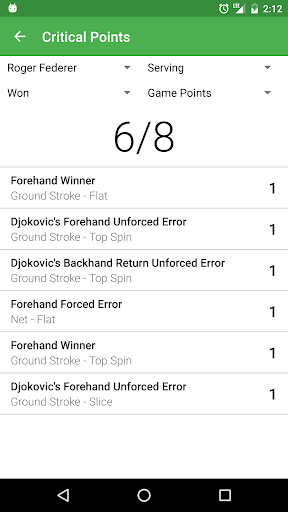 For each tennis match, we want to provide a clear picture of why the tennis match was won or lost. We want to give you a way of finding areas of improvement so the person being tracked can become a better tennis player. To achieve this, Tennis Match Tracker allows you to record how the point was won or lost, details about the point, and the ball location for the finishing shot. If this isn't enough, the user can write notes on any given point and view those notes at the end of the match. Once the match is complete, the information tracked from the match will be organized and presented in a way that is useful to you.