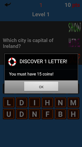 You can use the coins to discover one letter, hide 3 letters or skip the question.