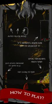 Tap on the screen on the left or right side of the hero to move in the desired direction. Move to the place where treasures lie and grab one of the jewels, then give it to the ally waiting on the other side of the screen (you can also try to catch jewels that falls from the top of the cave). Use your reflexes to avoid falling chunks of rocks. Tap on the cloak icon and hide to reduce the anger level (there is a dragon anger bar in the upper right corner which increases gradually when beast is angry). And remember, watch out for the eye!