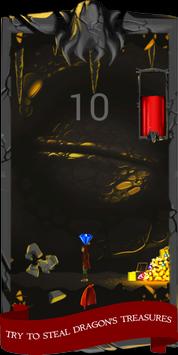 There is a greedy dragon sleeping on a piles of looted treasures and the brave hero, who will try to enter into the cave and steal them (player takes the role of brave hero). To reach the treasure is not an easy task because there are obstacles in the cave such as large stones which are falling on the player’s head. Moreover, beast opens eye from time to time to see what’s happening in his lair.