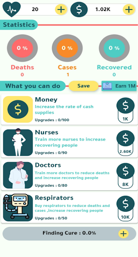 This game simply for finding cure to the infection ,so you can train more doctors and nurses ,buy medical aid and discover a cure as fast as possible to finish the infection