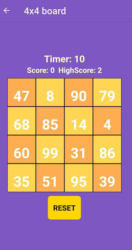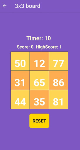 The player starts off by selecting a grid size of, 9, 16 or 2 squares. The numbers are randomly generated and the player must find the smallest number out of all of the other numbers trying to race the clock. After certain a certain amount of points, the timer slowly decreases making it difficult for the player to get a higher score!