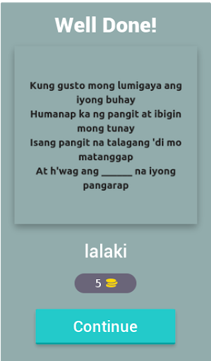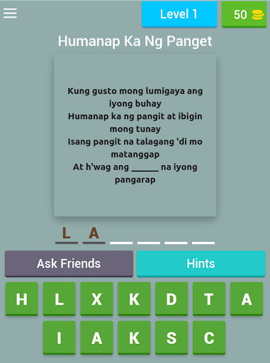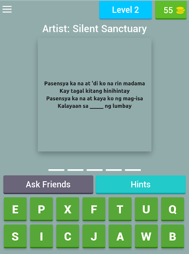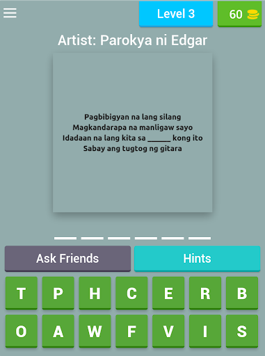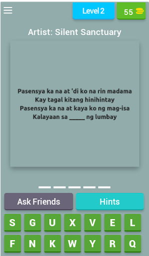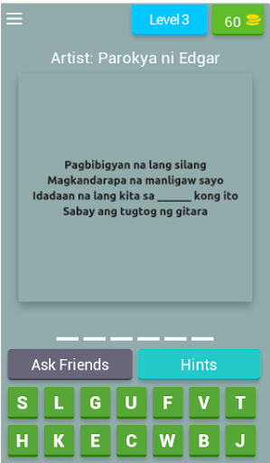 Find out how good you are with Original Pilipino (OPM) Music by filling the blank with the correct missing word. Each correct answer is rewarded with coins that you can later use to expose a letter, remove a letter, or even solve the game.