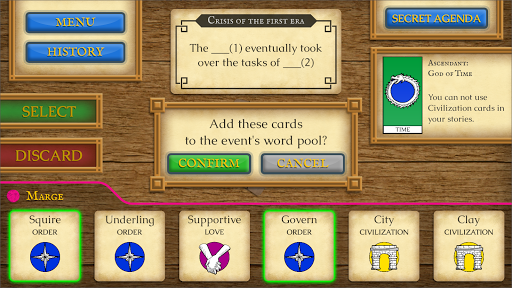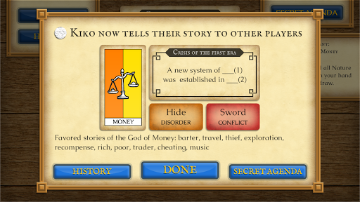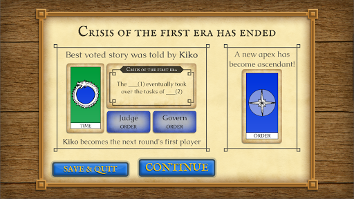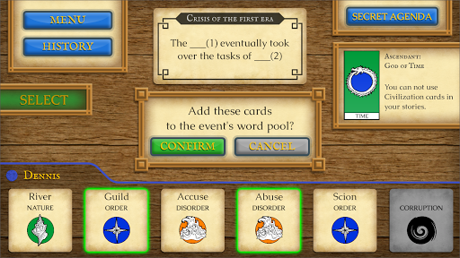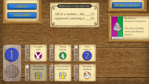 The game is played as a sequence of events, starting from the Origin event and ending after three Eras (i.e. 10 events) are completed. To decide the story and outcome of each event, each player has to select words for the event's gaps, then narrate a story based on the event and words, and then vote among all players' stories. After all players have taken turns voting, the story with the most votes is revealed by the application, and it becomes part of the history which must be continued in the next event.